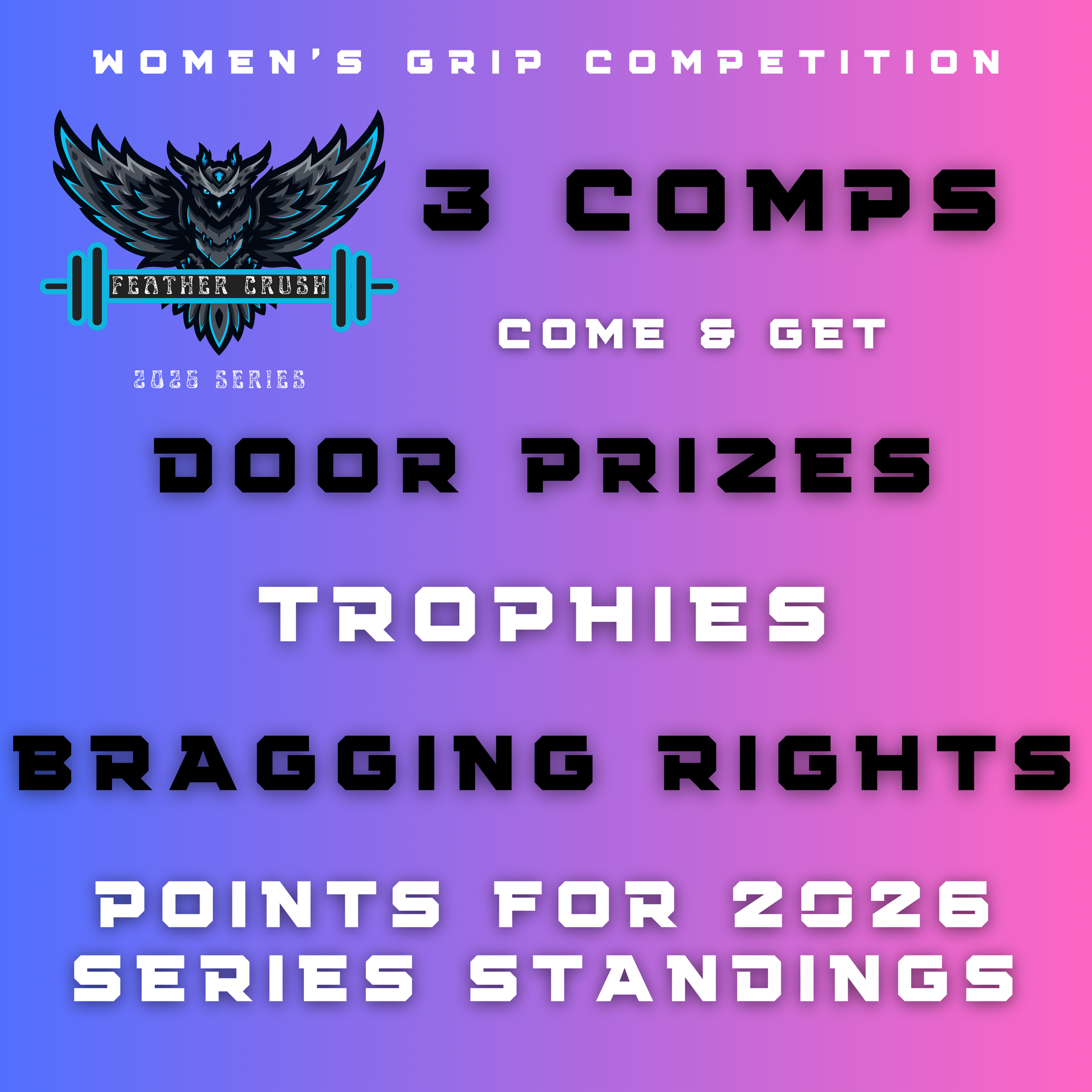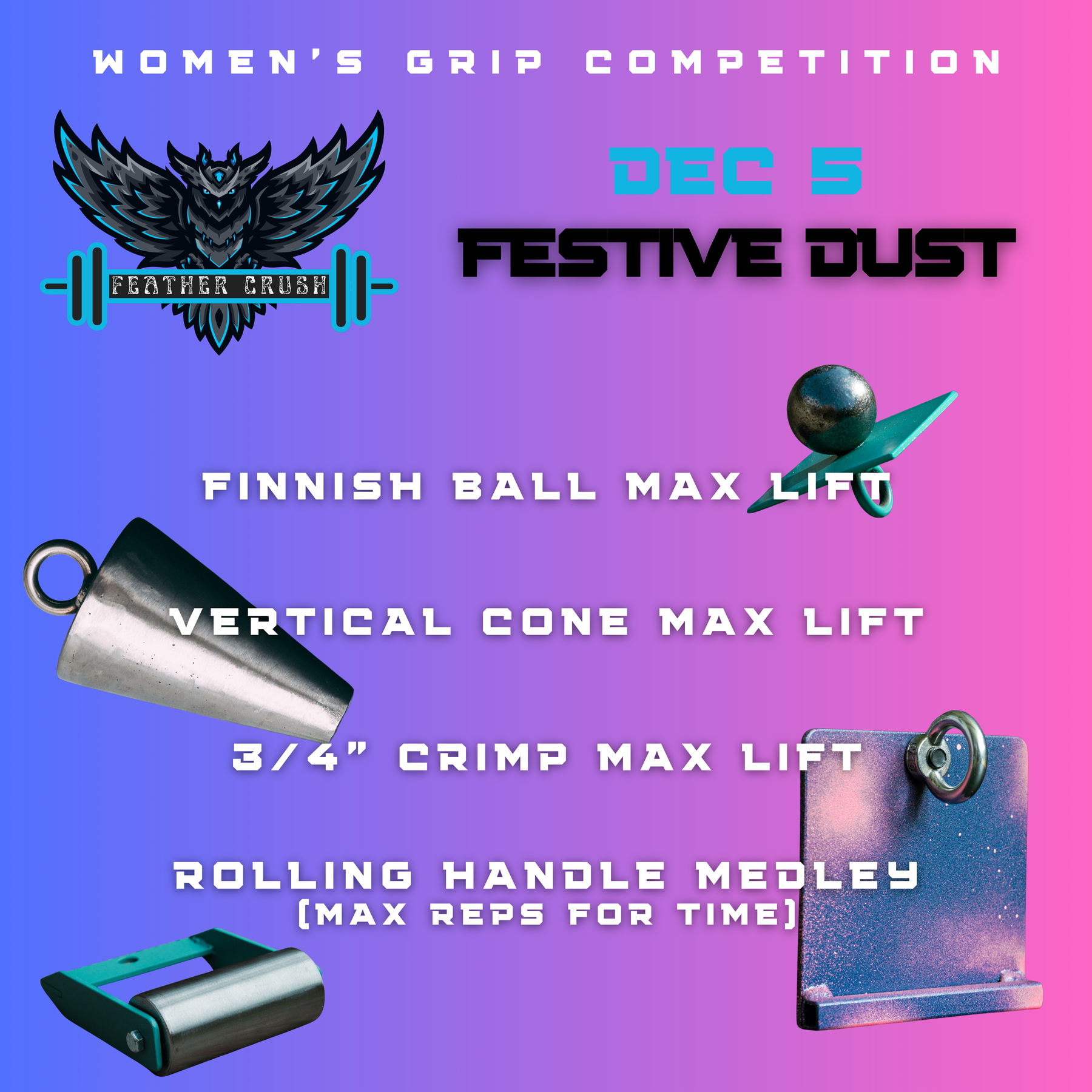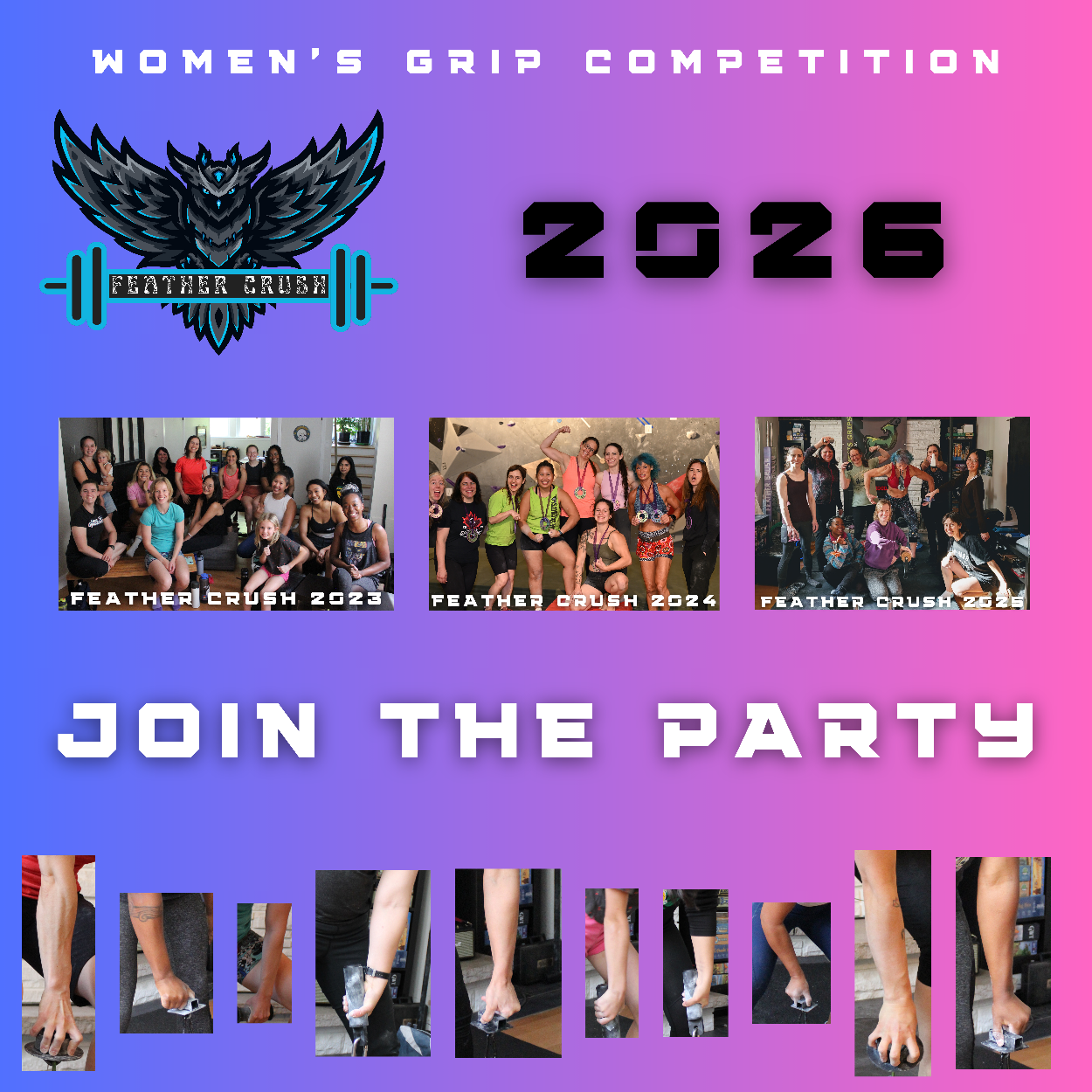 Feather Crush women's lifting events are a friendly and fun way to learn more about grip sport while setting official records. Whether you are here to see how much you can lift or gearing to beat your previous best, it's a welcoming and positive environment for you to show everyone how strong you are.